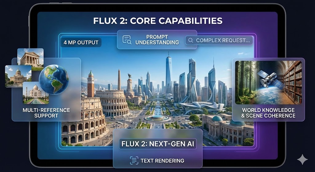 Flux 2 supports complex typography, UI mockups, infographics, logos, and fine text rendering — which older or less advanced models often struggle with. According to the official Flux 2 page, “text rendering” is a core capability.