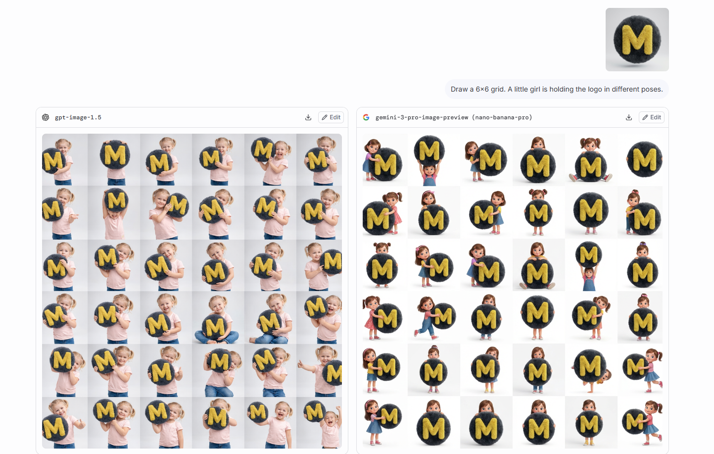 GPT Image 1.5 AI model maintains stable facial features, hairstyle, clothing, and overall character identity throughout the 6×6 grid, even as the girl’s pose and interaction with the logo change. This results in a coherent visual set suitable for brand assets or sequence-based content.