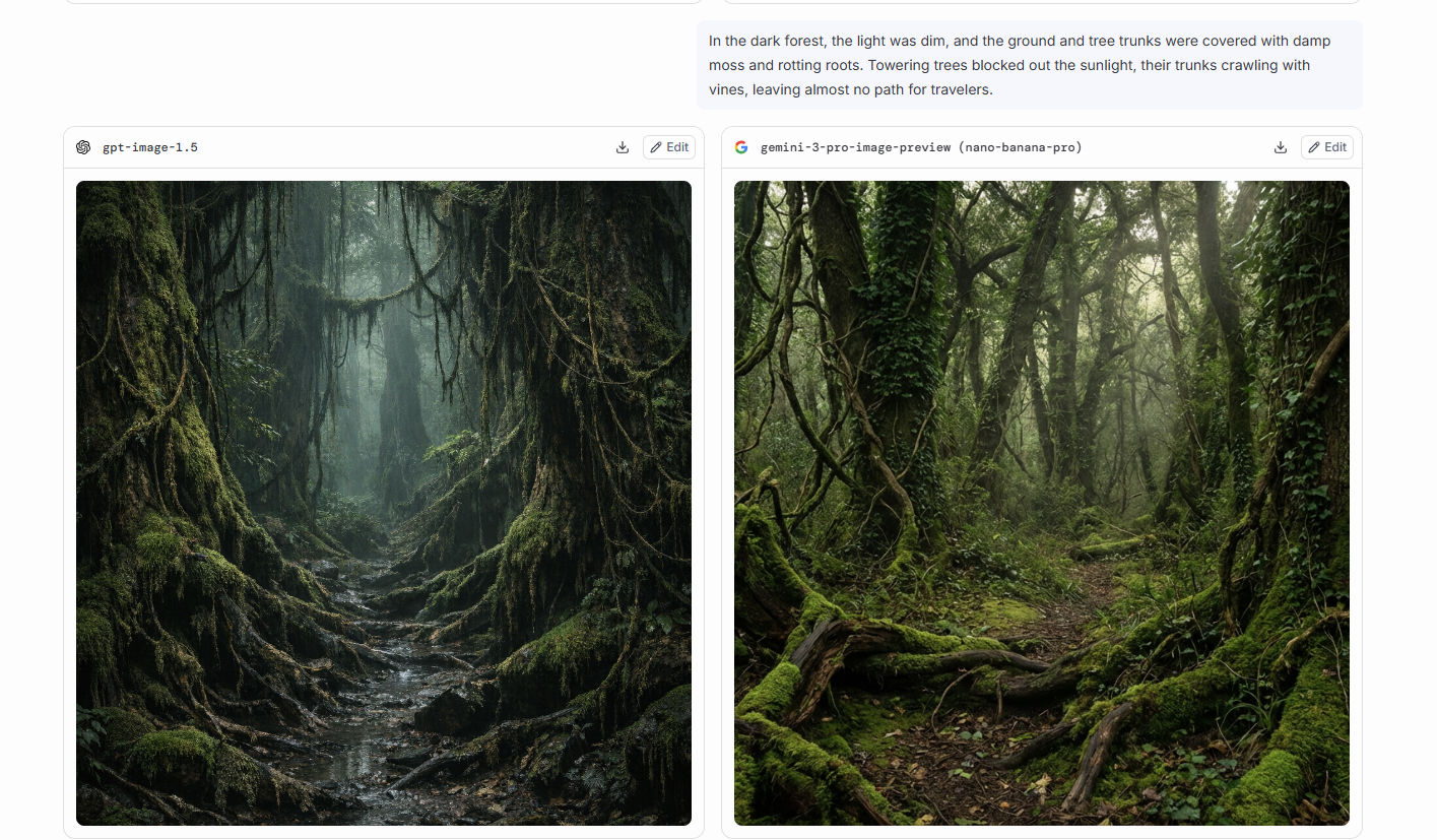 Nano Banana Pro, meanwhile, produces a more navigable forest scene with clearer depth and visibility, capturing environmental detail.