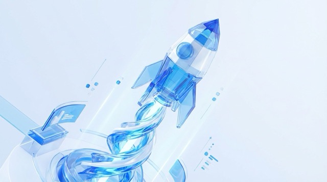 A rocket ship launching upwards, isometric 3D glass texture, corporate blue and white color palette, clean gradient background, minimalist tech aesthetic.