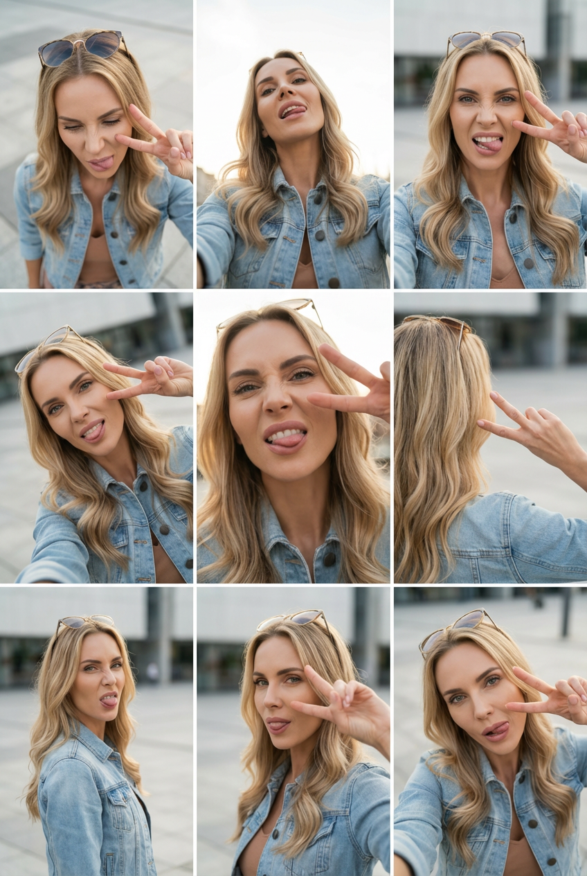 Generate a 3×3 photo grid. Fully preserve the face, hairstyle, and outfit from the uploaded image in all panels. The person should make a cute, funny, and slightly weird expression and pose, and the same expression & pose must be consistent across all 9 panels. Each panel should use a different camera angle. Use the following angles, in varied composition and framing: 1. High angle (top-down) 2. Low angle (from below) 3. Eye-level straight-on 4. Dutch angle (slightly tilted) 5. Close-up low angle 6. Over-the-shoulder angle 7. Wide shot from the side 8. 45-degree angle from the front 9. Slight bird's-eye angle Style Requirements: •Photorealistic, clean lighting •Real camera lens rendering •No illustration or cartoon look •Same outfit, face, and hairstyle across all images •The pose and expression stay identical across the grid •Modern, minimal aesthetic