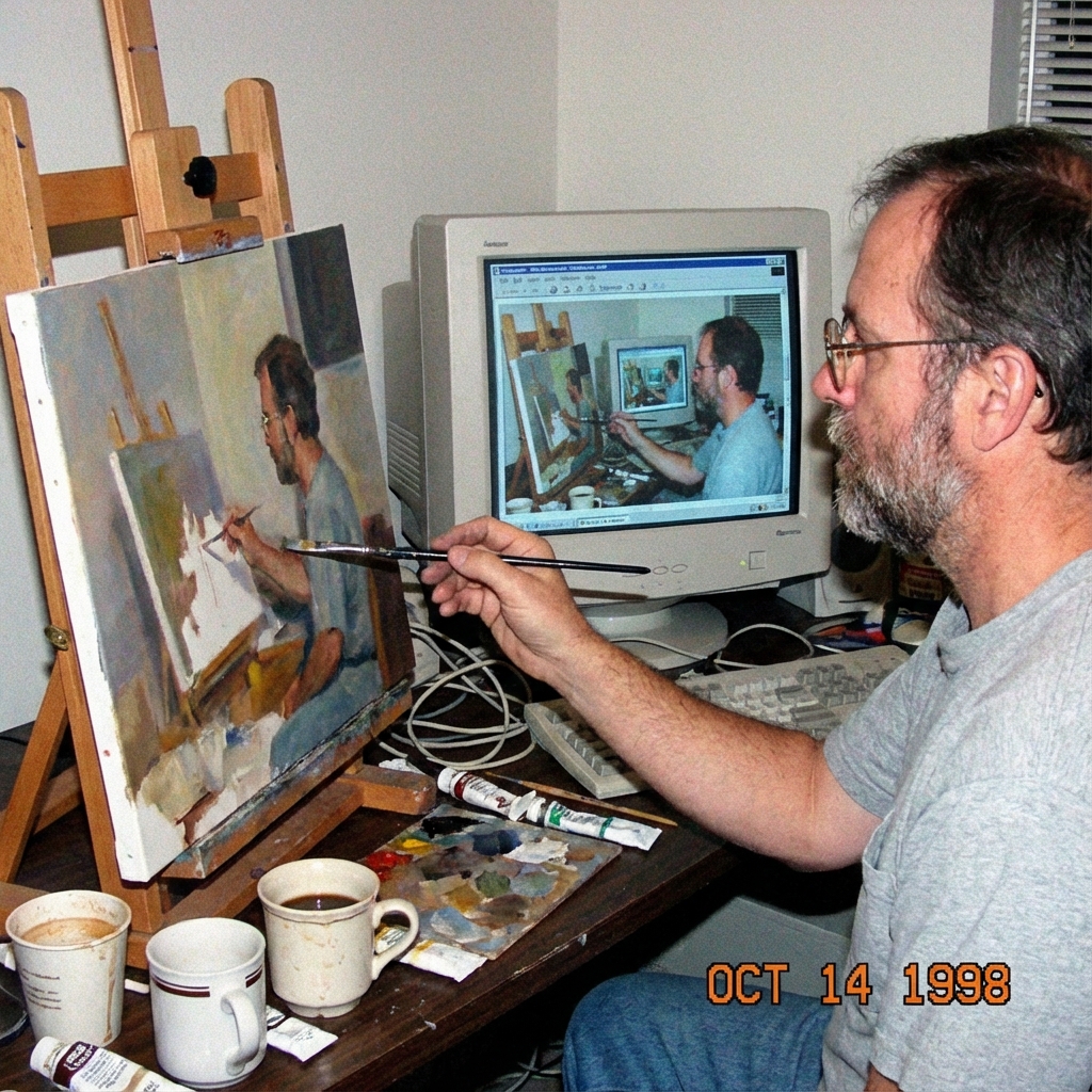 Amateur photograph from 1998 of a middle-aged artist copying an image by hand from a computer screen to an oil painting on stretched canvas, but the image is itself the photo of the artist painting the recursive image.