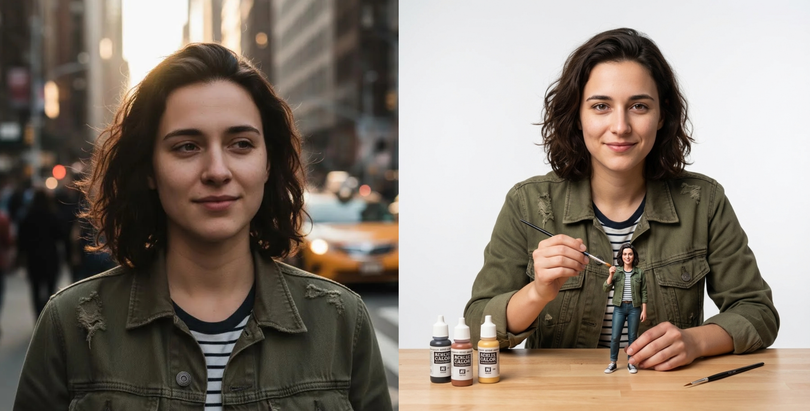 Create an image of this person as an artist painting a tiny miniature figurine version of themselves. The person is wearing their most iconic signature outfit, looking directly at the camera with a confident expression while holding a tiny paintbrush in one hand. The small action figure-sized version of themselves is prominently placed on a clean workbench in front of them - make the miniature slightly larger and more visible than realistic scale so it clearly stands out. The miniature figure is also wearing the same iconic outfit in a signature pose. Minimal art supplies on the workbench to avoid clutter - just 2-3 small paint bottles and one extra brush, keeping the focus on the person and their miniature. Soft neutral white background, professional studio lighting, shallow depth of field. The composition emphasizes the person's face looking at camera and the miniature figure they're working on. Clean, uncluttered, photorealistic style with high detail on both figures.