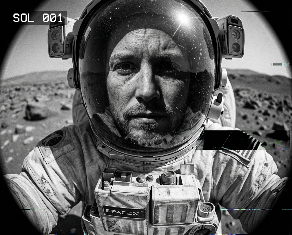 Raw wide-angle engineering camera footage from the Mars surface. Extreme fisheye lens distortion. A close-up "selfie" of the character peering into the rover's lens. The character is wearing a dusty, scuffed futuristic space suit (helmet off). The character's face is weathered, unshaven, and sun-damaged. The lens is covered in red dust particles and scratches. Harsh, direct sunlight casts deep black shadows. Low-resolution, monochrome transmission artifacts, digital timestamp overlay in the corner "SOL 001"