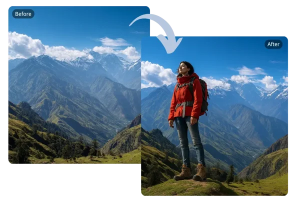 Experience the revolutionary way to add people to photo and combine people in photos effortlessly. Our AI to add people to photo intelligently blends portraits into any image with perfect lighting and natural proportions in seconds without any editing skills required.