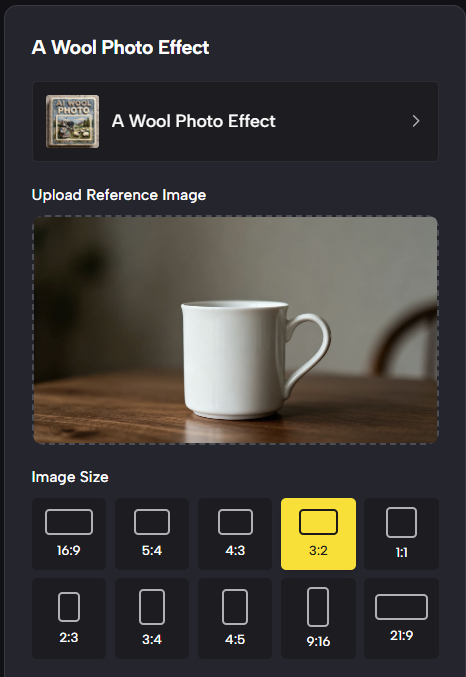 AI wool felt photo is an image to image effect that converts the surface texture of an image into a soft wool felt material while preserving the original composition, identity, and details.