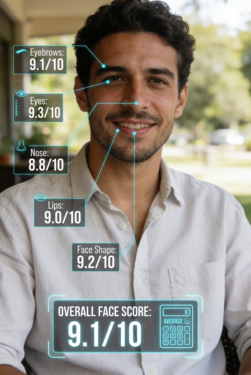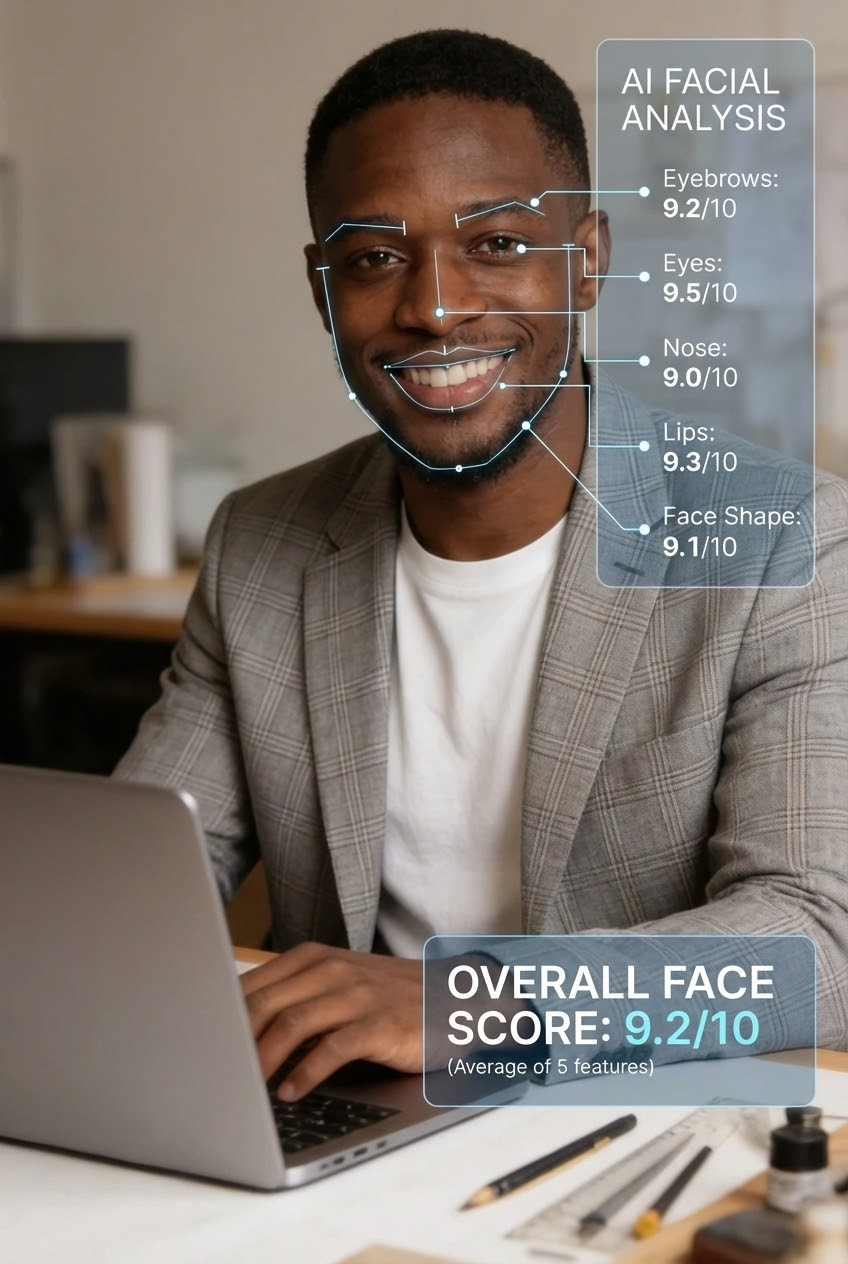 The system evaluates eyebrows, eyes, nose, lips, and face shape individually and calculates an average score using consistent AI logic.