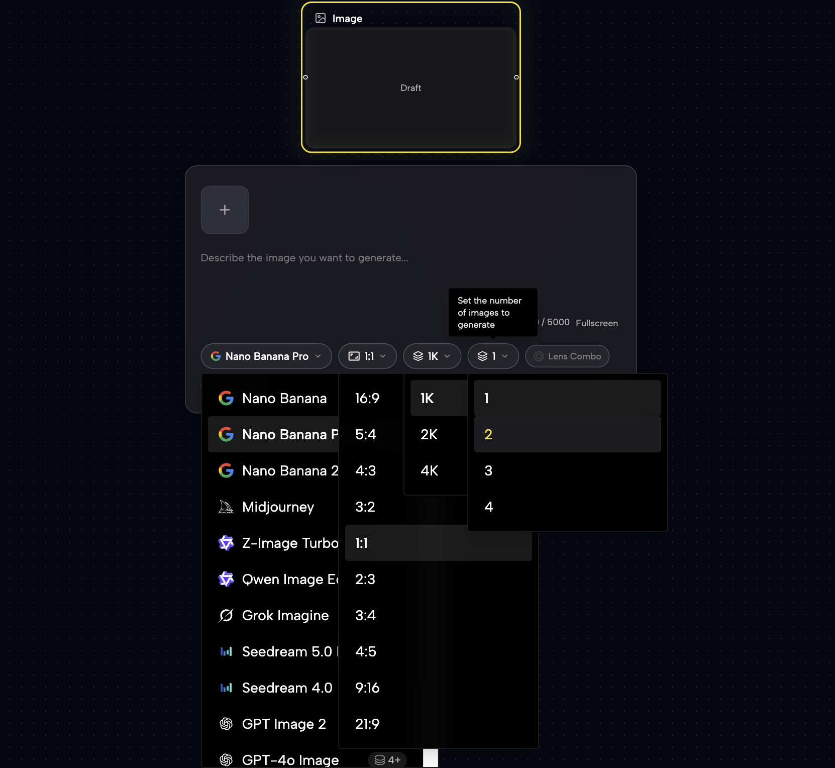 Yes! Use batch generation to explore ideas quickly. Generate up to 4 variations per node with one click. You can view them side-by-side, set a favorite as the primary result, or drag them out to create new standalone nodes.