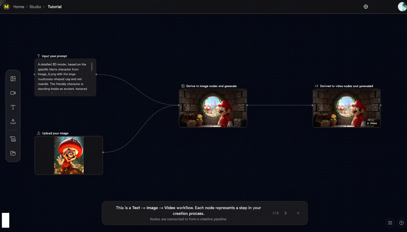 - Connect node handles to build a canvas pipeline (e.g., Text → Image → Video).