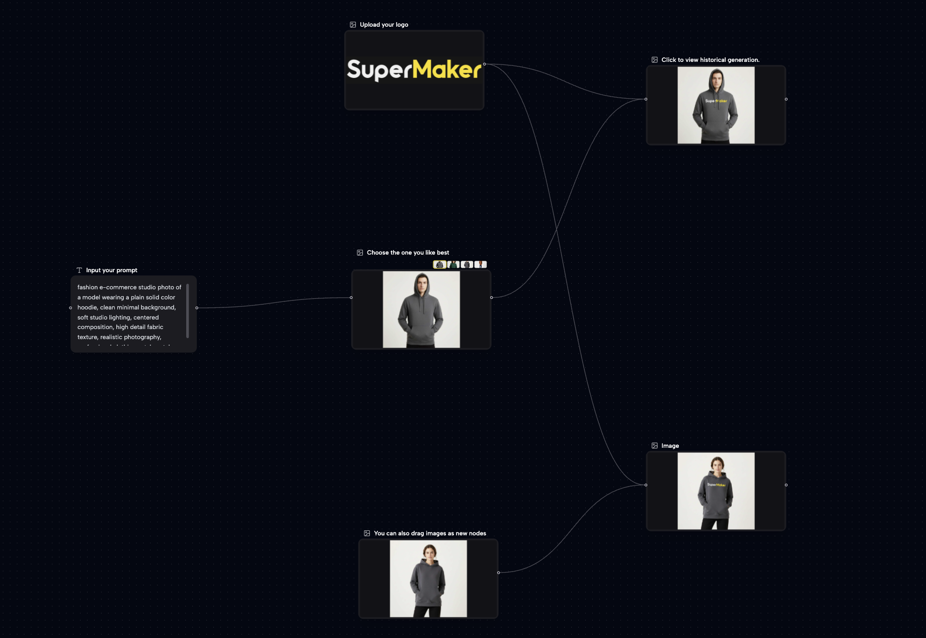 SuperMaker AI Studio is a free visual canvas for AI creation. It allows you to organize image and video generation into a zoomable, node-based canvas workspace.