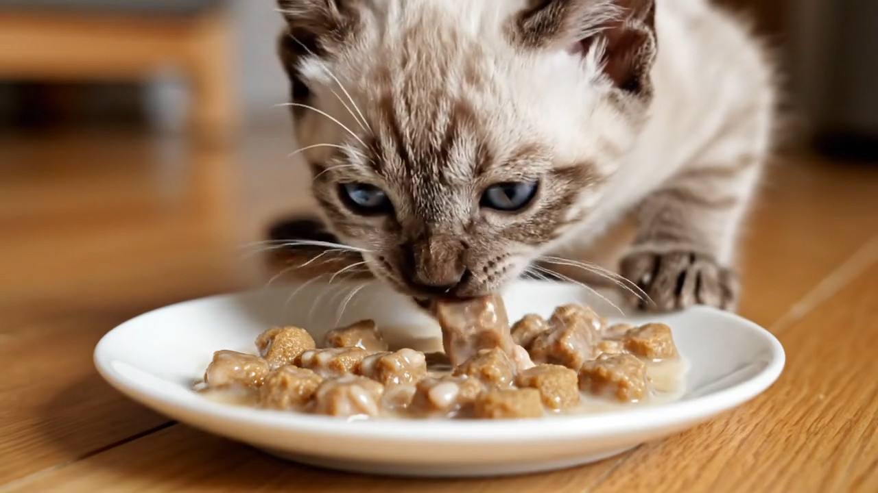 Generate a cat eating food video for viewers who enjoy calming animal content. Soft lighting, tiny bites, gentle licking, and quiet cat eating ASMR make the final pet mukbang feel peaceful and comforting.
